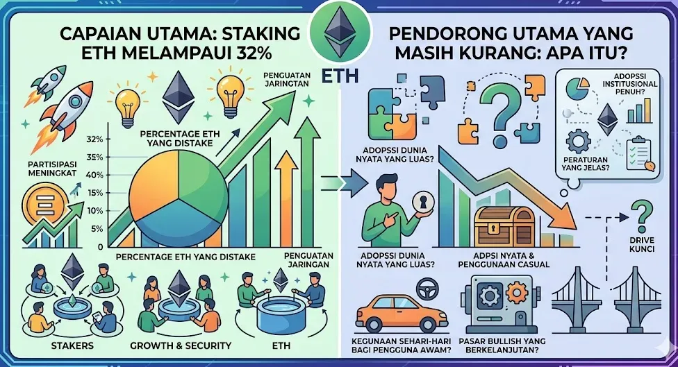 Pencapaian 32% pasokan ETH dalam staking adalah bukti kepercayaan jangka panjang validator, namun kegagalan ETH mempertahankan level $2.350 (via Bitcoin Ethereum News) menunjukkan adanya diskoneksi antara keamanan jaringan dan apresiasi harga. Di saat Indonesia fokus pada kedaulatan pangan melalui surplus beras (via Antara) dan stabilitas fiskal melalui Danantara (via The Straits Times), ekosistem Ethereum sedang mencari "alasan baru" bagi investor untuk terus membeli di luar sekadar imbal hasil staking.